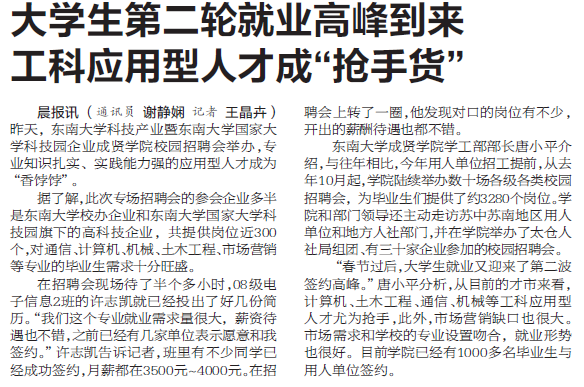 晨报讯(通讯员 谢静娴 记者 王晶卉)昨天,东南大学科技产业暨东南大学国家大学科技园企业成贤学院校园招聘会举办,专业知识扎实、实践能力强的应用型人才成为“香饽饽”。