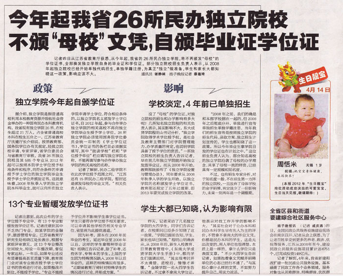 【扬子晚报】今年起我省26所民办独立院校自颁毕业证学位证