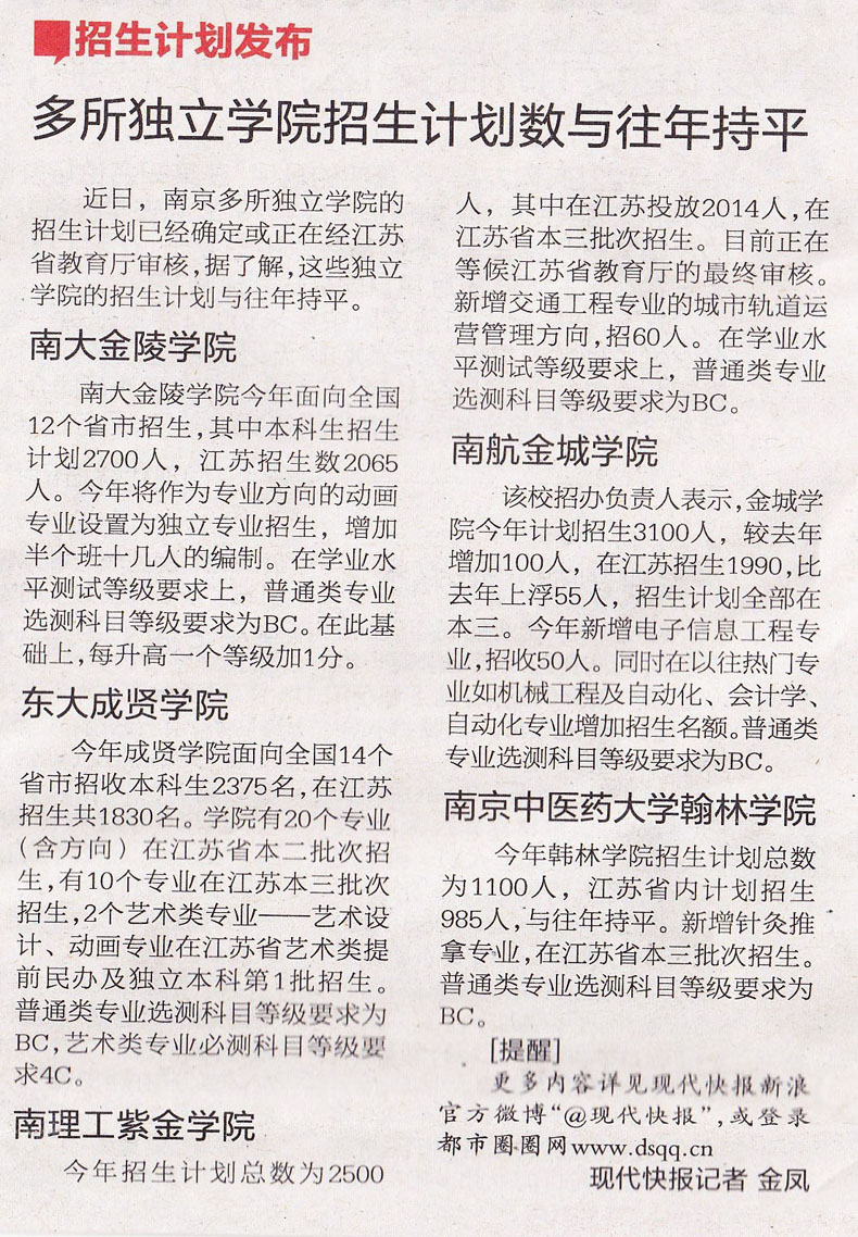 【现代快报】多所独立学院招生计划公布