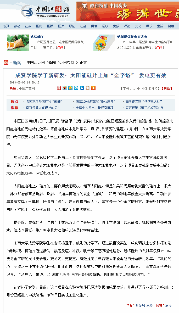 【中国江苏网】成贤学院学子新研发:太阳能硅片上加“金字塔” 发电更有效