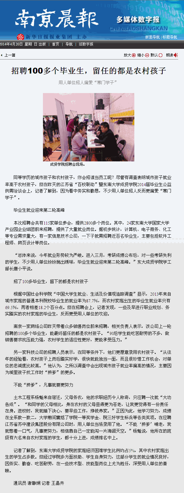 【南京晨报】招聘100多个毕业生,留任的都是农村孩子