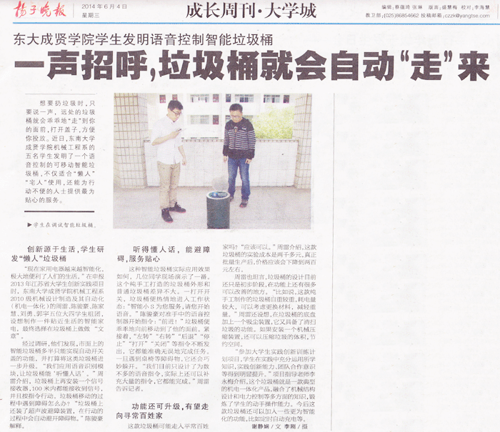 【扬子晚报】东大成贤学院学生发明语音控制智能垃圾桶