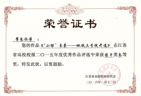 1月13-15日,江苏省高校校报研究会2015年年会在南京召开,会上揭晓了2015年度江苏省高校校报优秀作品评比结果,我院校报《成贤报》刊发的《这样的地震安置过渡房,实用又“有范儿”》荣获通讯类三等奖,《“小绿”来袭——地铁三号线开通》荣获图片类三等奖。