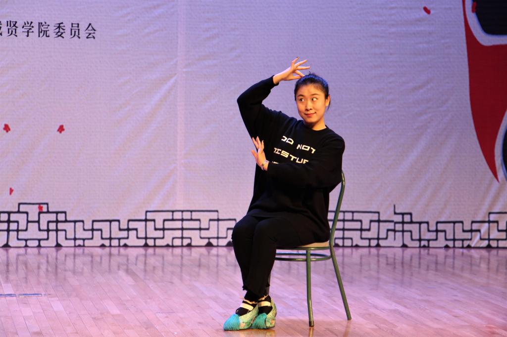 讲座伊始,龚老师向我们简述了京剧博采众长、兼容并蓄的文化起源及发展历程,激发了同学们对京剧历史的兴趣。随后,龚老师向大家解释了京剧的虚拟化和程式化表演,讲演结合地把“四功、五法”等专业知识形象生动地展示出来,龚老师举梅兰芳先生训练眼神技巧的例子,强调表演中通过眼神传达情感的重要性,赞美了京剧源于生活而高于生活的艺术性。最后,龚老师提到王瑶卿先生打破“一人一行”的传统开创了花山戏,向大家传达了京剧的精益求精和蓬勃的生命力,龚老师指出真正的京剧艺术家,无论唱念做打,均能够刻苦训练,一丝不苟,“台上十分钟,台下十年功”,换来的是京剧艺术的博大精深,体现着民族精神与智慧。讲座期间龚老师与同学们倾情互动,让同学们真切地感受到演员举手投足间的神韵和婀娜多姿的身段,博得阵阵掌声和喝彩。