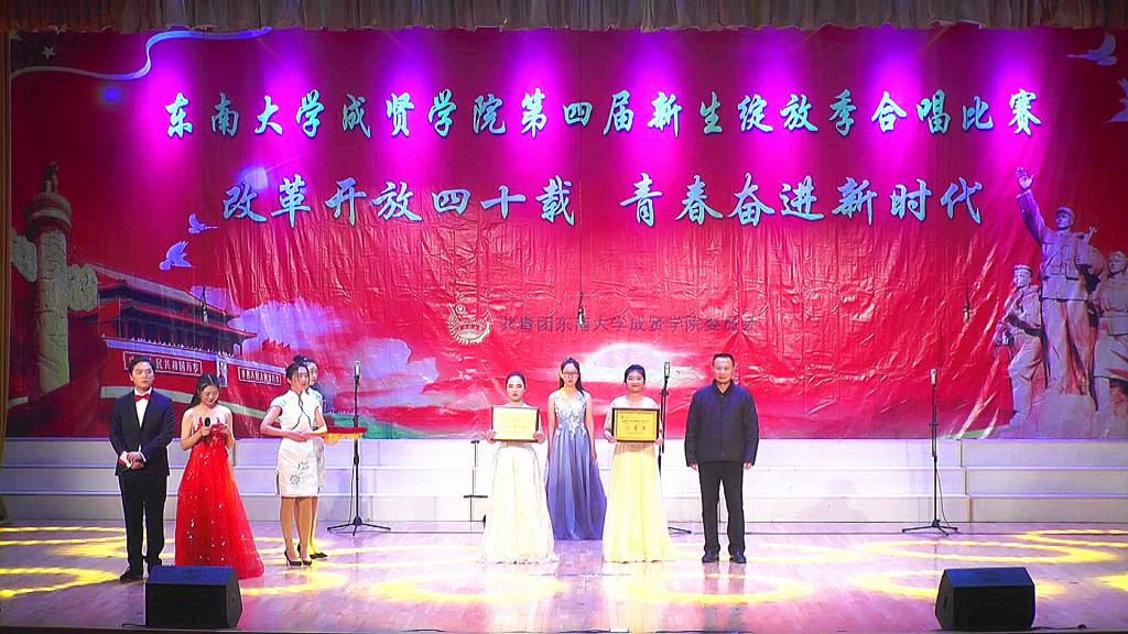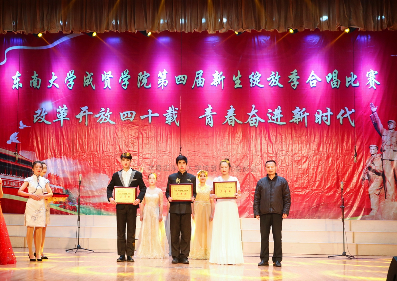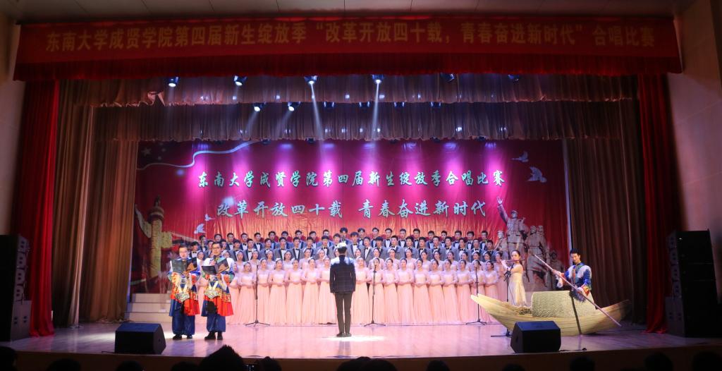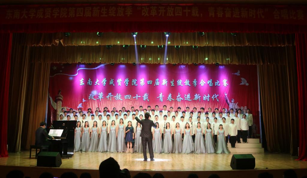 比赛中,大学生艺术指导中心音乐团倾情演绎歌曲《望春风》,展现了经典民谣的优美旋律;各学院老师积极参与指导与演出,师生们通力合作,用铿锵有力、激昂向上的歌声引发了观众对改革开放四十周年来伟大变革的共鸣,充分表达出成贤学子更加坚定走中国特色社会主义道路、改革开放道路的信心与决心。比赛在全场齐唱雄壮的《东南大学校歌》声中圆满结束。