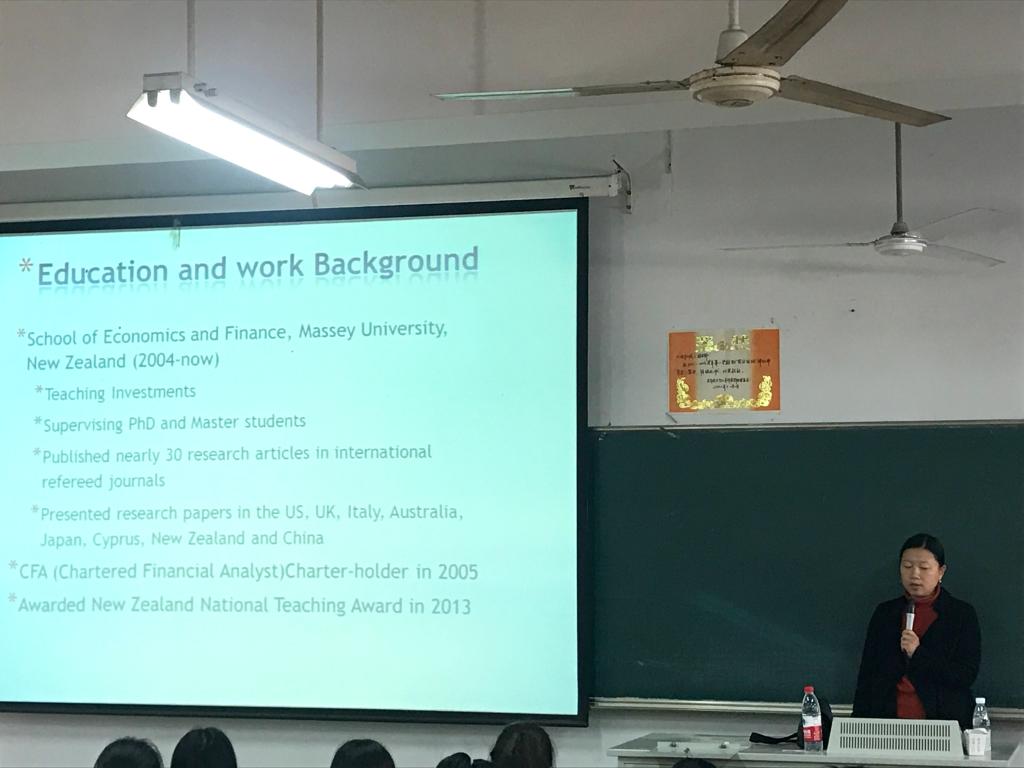 4月1日下午,新西兰梅西大学经济与金融学院金融学副教授迟晶博士访问我校并在文昌院203教室做了学生项目专场宣讲会,200名学生现场聆听。宣讲会由发展合作处张务一老师主持。