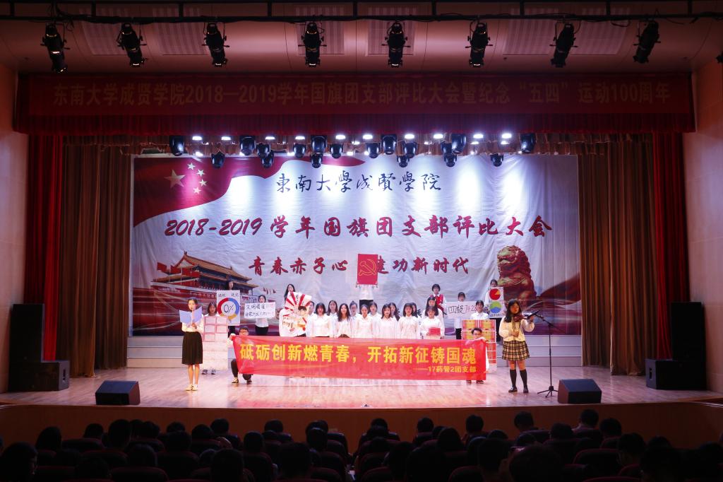 大会以慷慨激昂的《光荣啊,中国共青团》团歌拉开帷幕,紧接着,通过短视频回顾了上一年优秀特级团支部的风采。随后,入选的9个团支部根据抽签顺序展示了各支部在基层团支部建设、班风学风建设、思想教育建设上取得的进展与成绩,评委根据各支部递交的材料及现场的展示、答辩各方面情况进行综合打分。经过激烈角逐,2017级建筑学1团支部获新年度“国旗团支部”“活力团支部”荣誉称号;2017级交通运输1团支部、2017级药事管理2团支部获“活力团支部”荣誉称号。