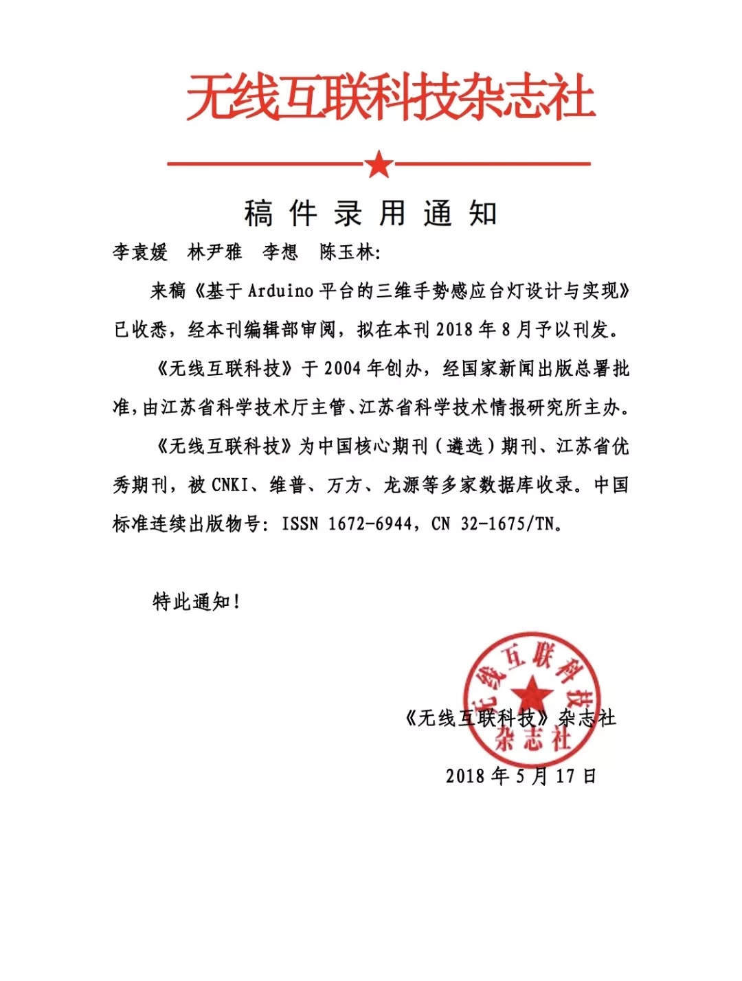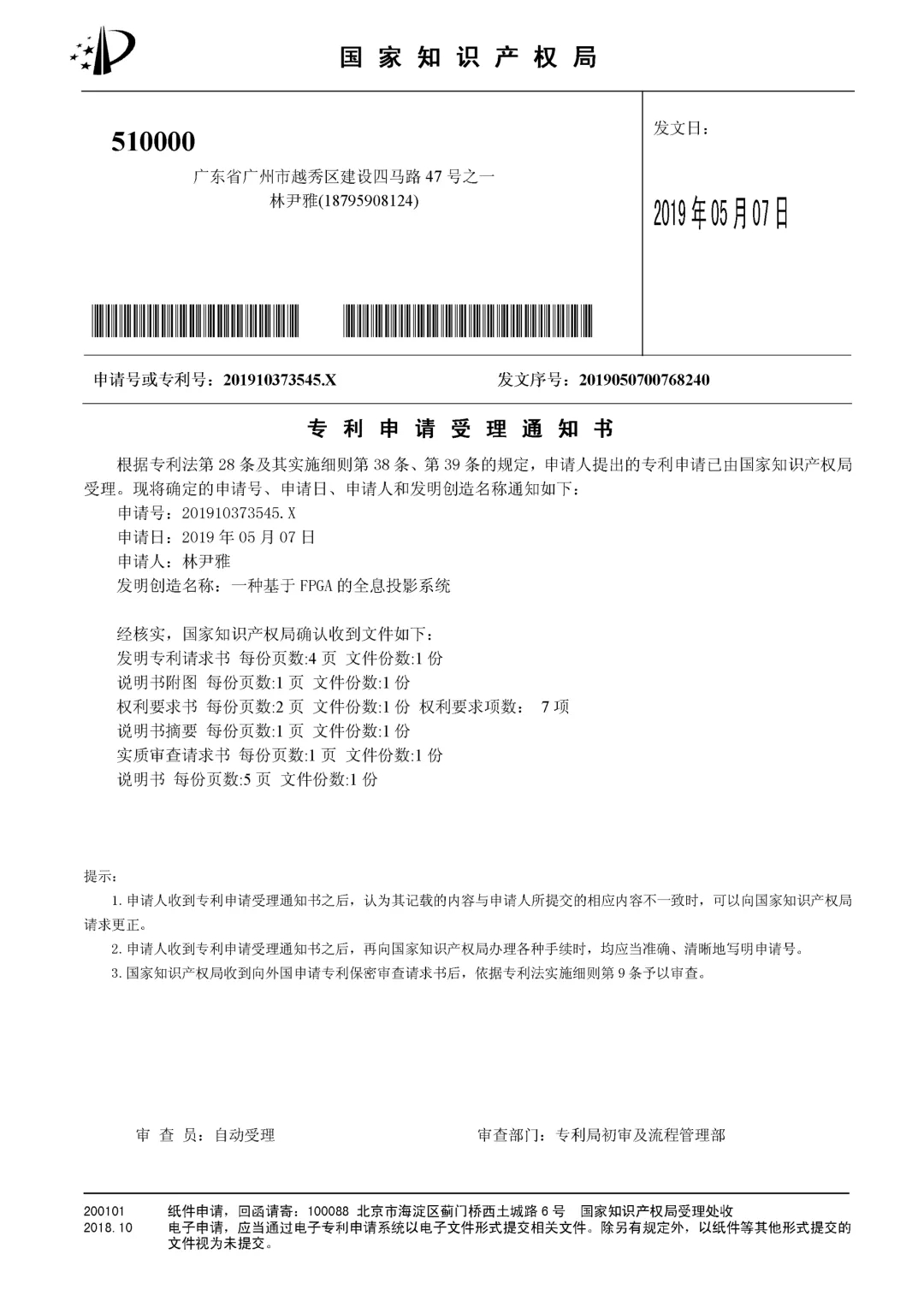 稿件录用通知书和《一种基于FPGA的全息投影系统》专利受理通知书