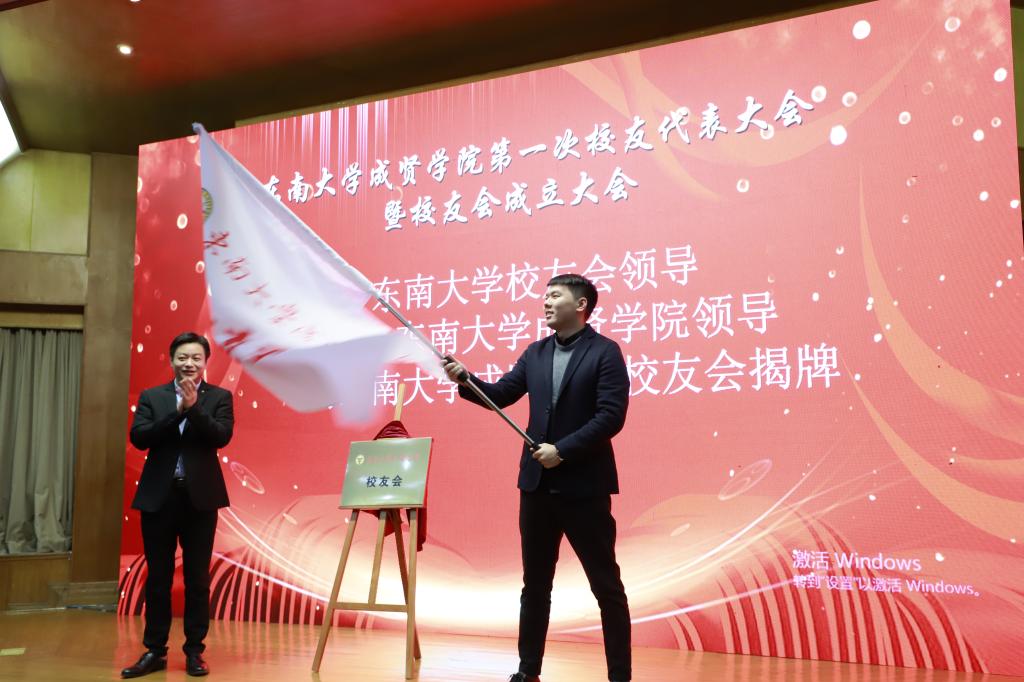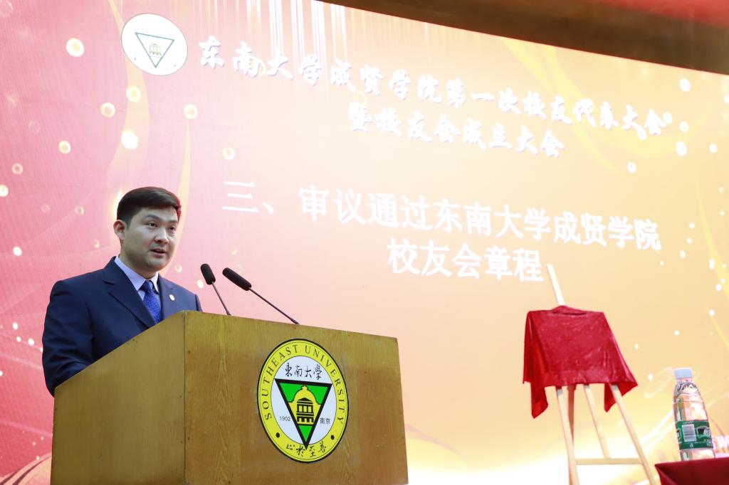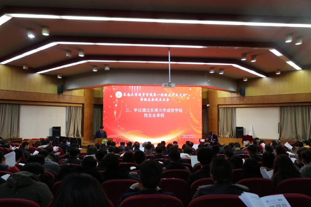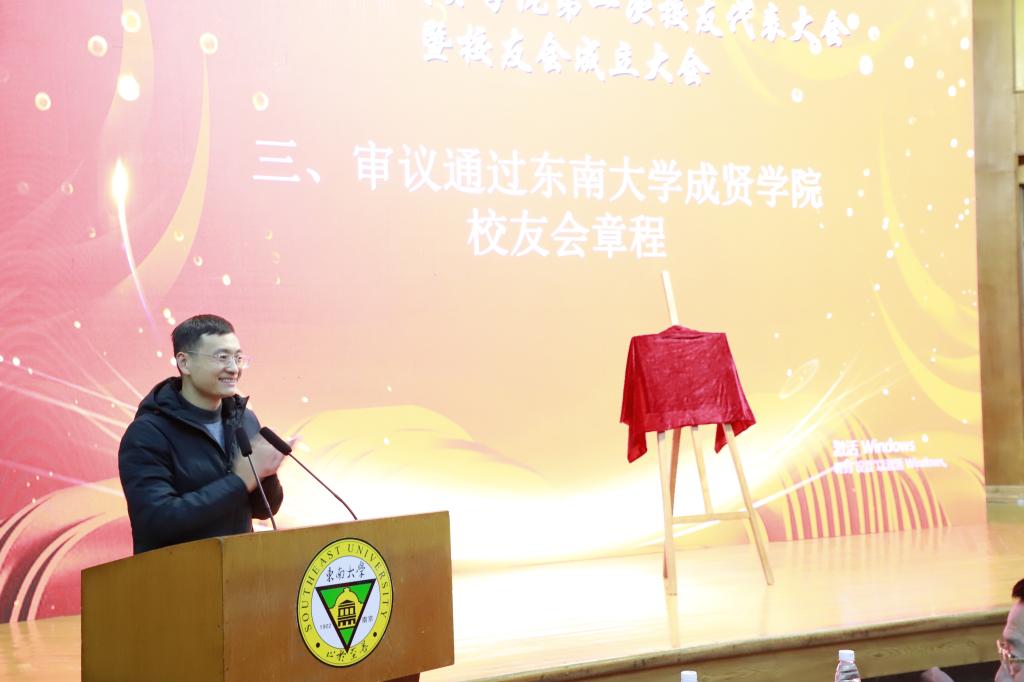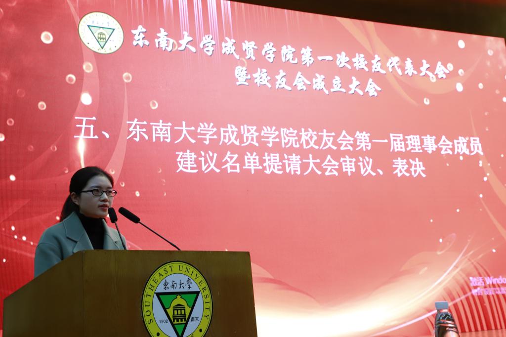 大会在东南大学校歌中拉开帷幕。首先,校友会筹备工作办公室副主任、校团委书记、人武部部长潘明烽汇报了东南大学成贤学院校友会筹备工作情况。随后,大会审议通过了《东南大学成贤学院校友会章程(草案)》,东南大学校友总会副秘书长曹军与东南大学成贤学院党委书记邢纪红共同为东南大学成贤学院校友会揭牌,邢书记为校友代表授予校友会会旗。接着,大会又审议通过了《东南大学成贤学院校友会第一届理事会成员建议名单》。休会期间,所有理事会理事参加了在真知馆105会议室召开的东南大学成贤学院校友会第一届理事会,并选举产生了东南大学成贤第一届理事会会长、副会长、秘书长、常务理事;聘任了校友会副秘书长、校友会办公室主任。