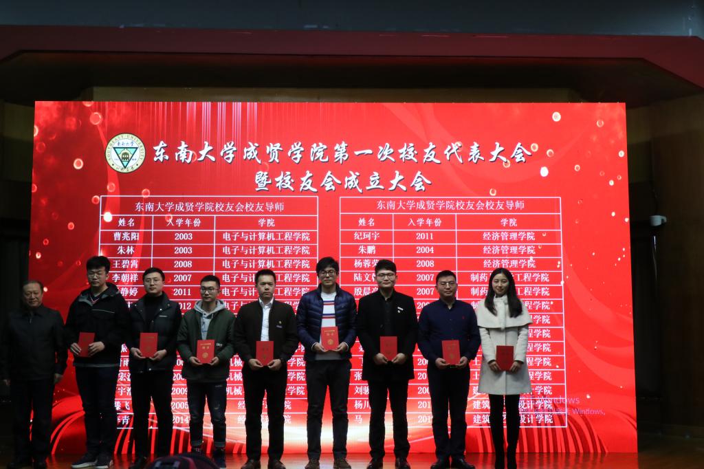 理事会后,大会进行第二阶段议程。校友会第一届理事会会长——常务副院长许映秋发表讲话,感谢学校和各单位对校友会成立的大力支持,并表示校友是学校建设和发展的重要力量,在学校人才建设、对外联络与合作、筹集教育发展基金、提高社会声誉等方面发挥重要作用。许会长代表校友会第一届理事会全体成员承诺:认真履行职责,用扎实的工作为校友会和学校的发展竭尽全力,同时希望广大校友充分利用校友平台携手相伴、同向同行,为母校事业发展群策群力,再谱华章。随后,东南大学校友总会综合部副主任杨丽荣宣读贺信,表达了东南大学校友会对成贤校友会创建的大力支持。紧接着,校友代表曹兆阳发言,他在讲话中回忆了美好的成贤生活,感谢校友会为母校与校友搭建了桥梁,号召校友们为母校的发展不断作出贡献。最后,院长顾问程明山为东南大学成贤学院校友导师颁发聘书,党委书记邢纪红为校友企业授牌,常务副院长许映秋为校友会信息平台系统技术顾问薛军颁发聘书。