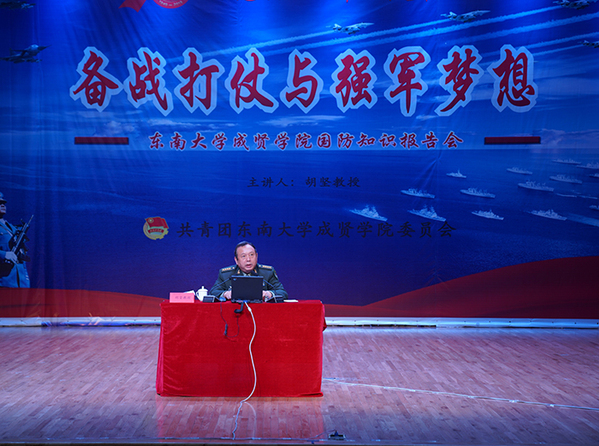 为进一步深化“不忘初心、牢记使命”主题教育,更好地了解当前的国防军事形势,12月12日晚上,南京陆军指挥学院原首席专家胡坚教授做客东南大学成贤学院,在综合楼报告厅为700余名师生带来了一场以《备战打仗与强军梦想》为主题的国防知识报告会。校团委书记、人武部部长潘明烽主持报告会。