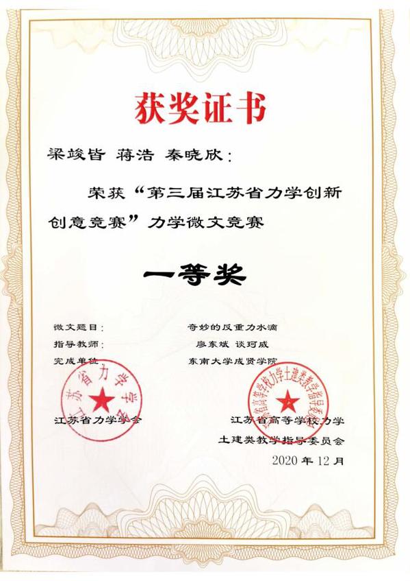 近日,“第三届江苏省力学创新创意竞赛”评审工作落下帷幕。我校土木与交通工程学院廖东斌、谈珂威、陈亮三位老师积极组织,精心备赛,在他们的指导下,徐璇、王欧缘两位同学的作品《力与美的碰撞》获力学文化创意竞赛特等奖(第一名),梁竣皆、蒋浩、秦晓欣三位同学的作品《奇妙的反重力水滴》获力学微文竞赛一等奖,李文涛、胡玮、沈伟伟三位同学的作品《不“科学”的科学》以及张孟睿、禹湘、孙文韬同学的作品《在客船上的跳远问题》获力学微文竞赛二等奖。