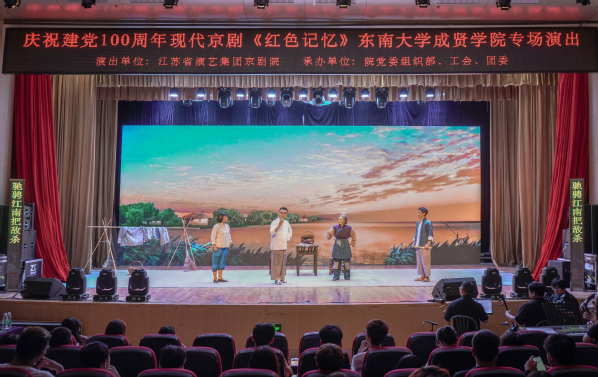 5月25日晚,由东南大学成贤学院党委组织部、工会、团委承办,大学生艺术指导中心协办,江苏省演艺集团京剧院演出的庆祝建党100周年京剧党课《红色记忆》专场演出在我校综合楼313报告厅上演,各院党员、预备党员、入党积极分子共计700余名师生共同观看了演出。