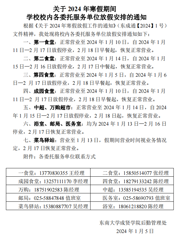 关于2024年寒假期间学校校内各委托服务单位放假安排的通知