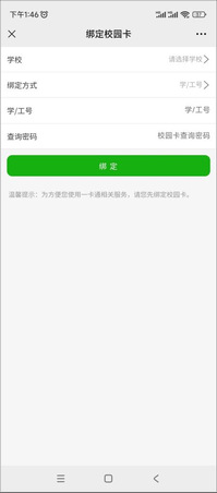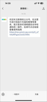 (2)打开“新微校”公众号后,点击“充值”,初次使用可能需要绑定校园卡,按提示操作即可。