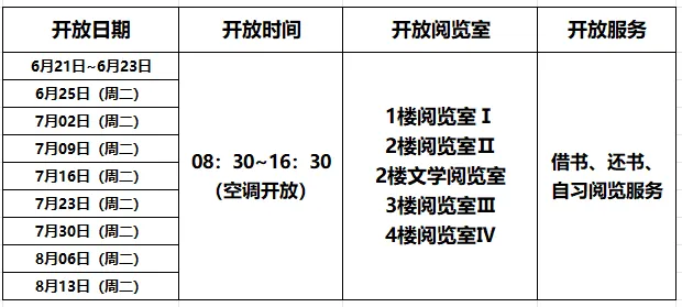 为方便读者暑假期间充分利用图书资源,自2024年6月21日起,图书馆开放安排如下: