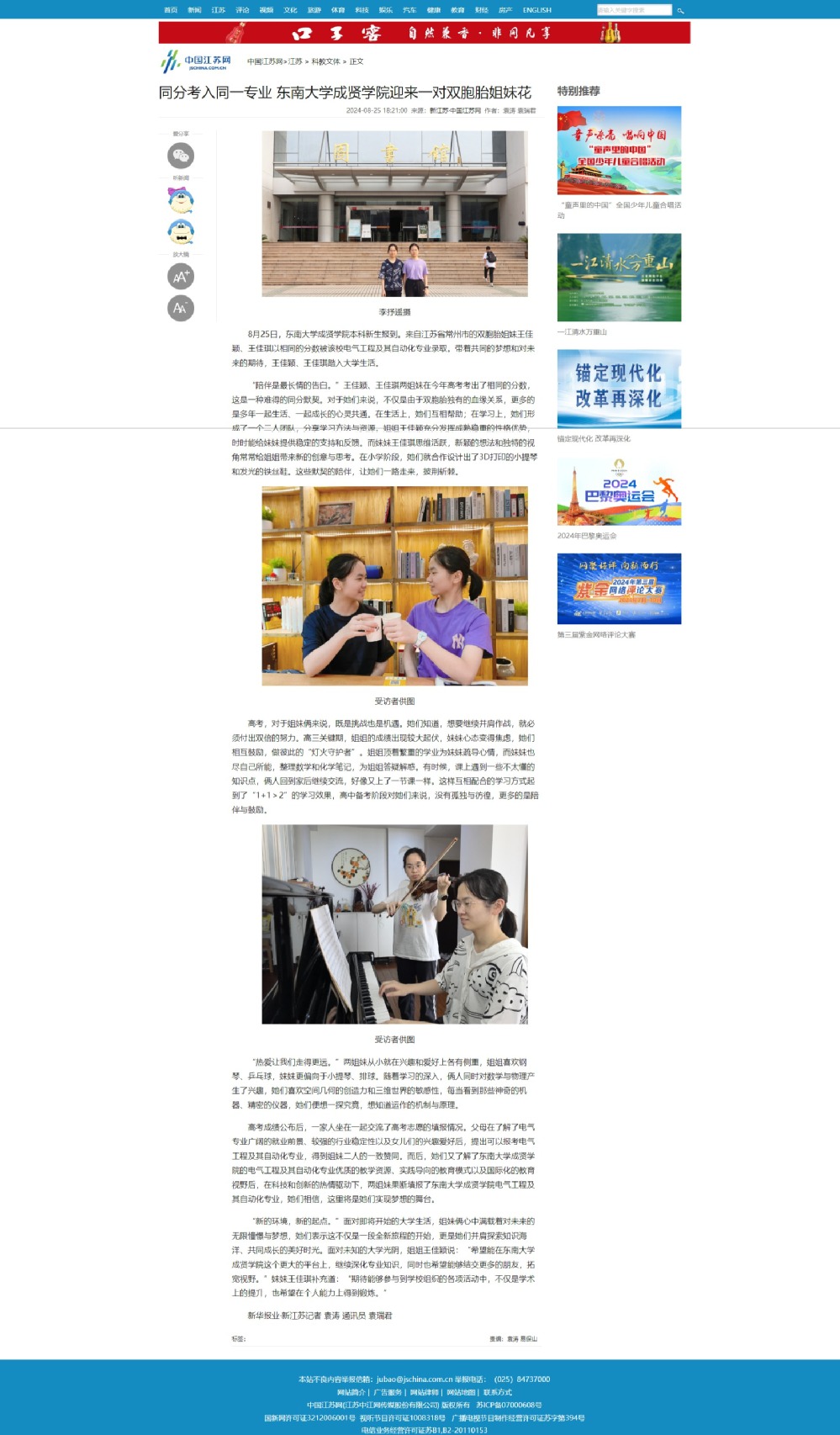 【中国江苏网】同分考入同一专业 东南大学成贤学院迎来一对双胞胎姐妹花
