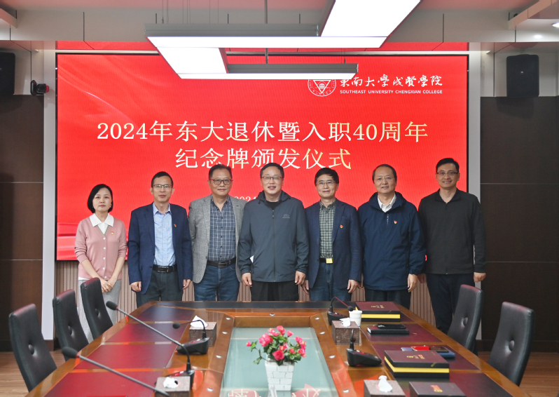 10月21日上午,一场简单而温馨的东大退休暨入职40周年纪念牌颁发仪式在我院真知馆207会议室举行。2024年东大退休暨入职40周年员工——我院学生处处长施杰、保卫处处长陈学建、图档信息中心主任沈冬生及所在部门代表参加仪式,学院党委书记张志胜、常务副院长黄学良,分管院领导党委副书记、副院长、纪委书记王荣,分管院领导副院长戴玉蓉受邀出席。仪式由组织人事部部长汪旭东主持。