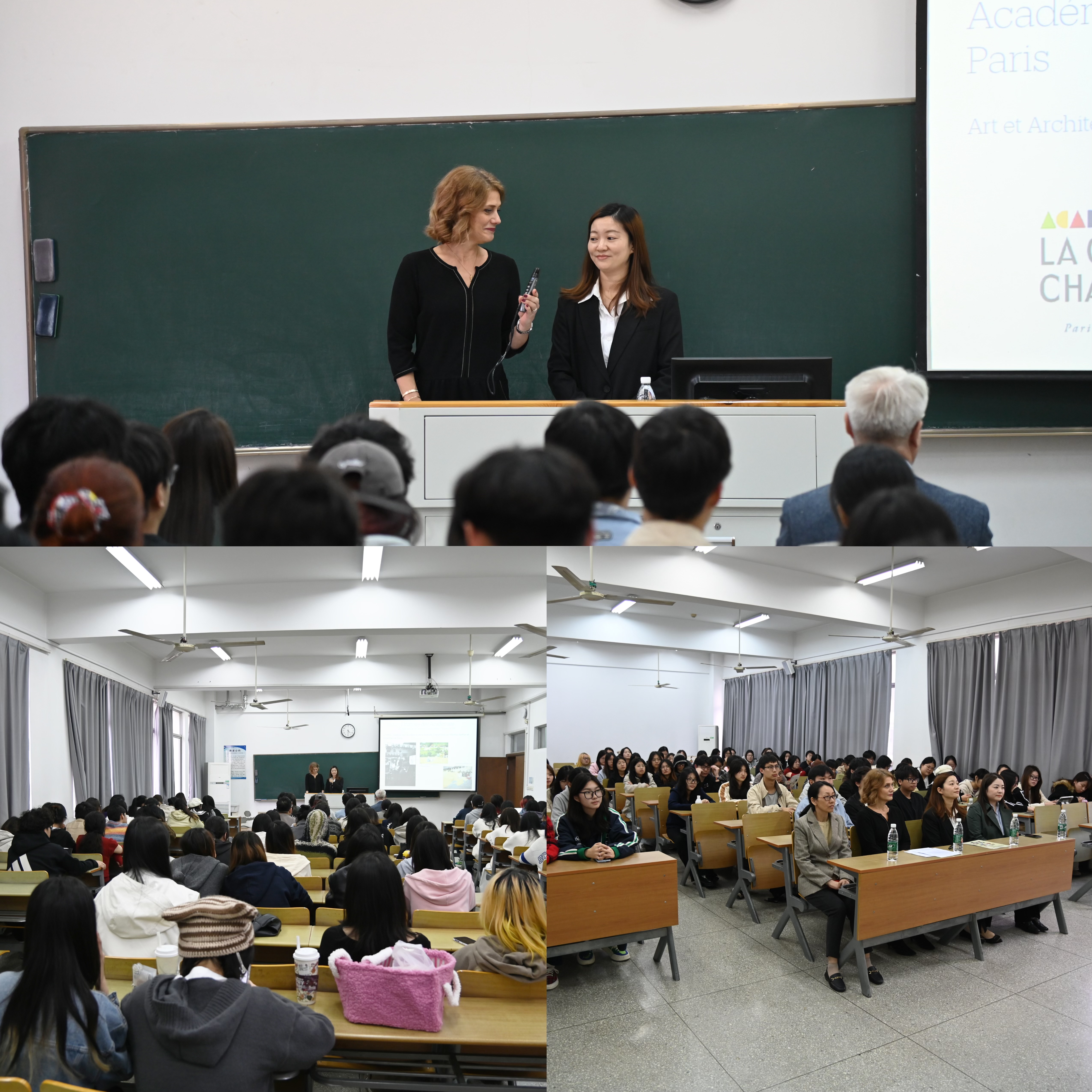 最后,法方学校一行来到建筑与艺术设计学院教室与学生面对面分享交流,从学期交流、多维度课程、申请条件到社会实践、就业指导、奖学金等方面,全面向学生介绍了项目基本内容,帮助学生全方位了解巴黎夏庞蒂埃
