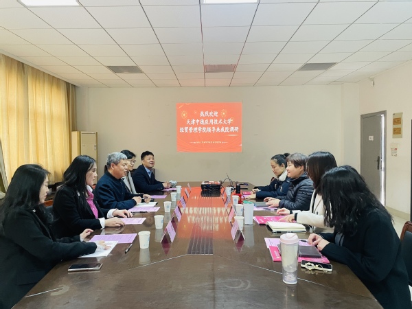 3月31日,天津中德应用技术大学经贸管理学院副院长孙学成一行5人莅临我校经济管理学院调研交流,双方围绕财务管理、电子商务等专业的建设与发展展开深入研讨,我校经济管理学院院长戚啸艳、副院长高凯丽及教研室主任参加座谈。