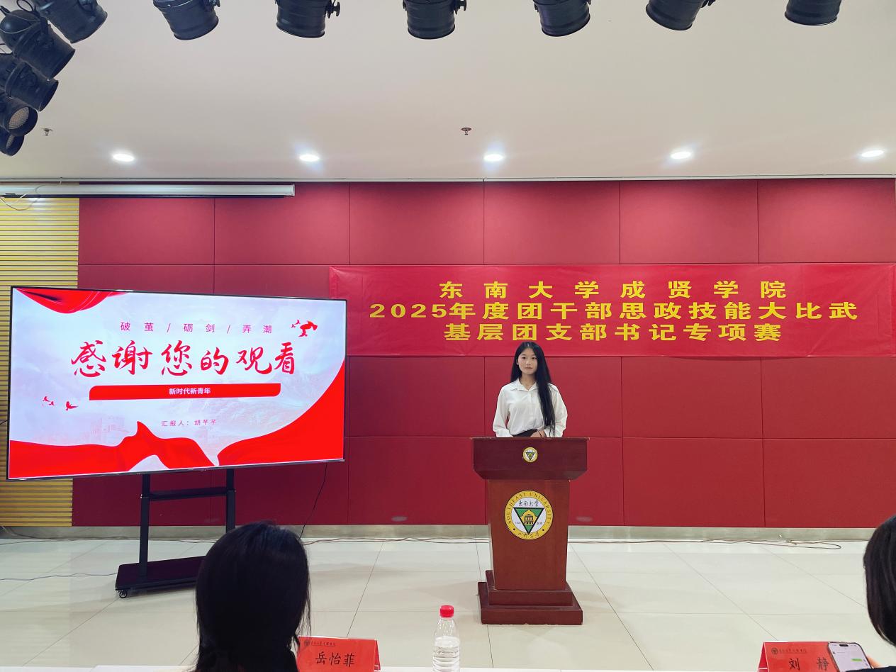 为深入学习贯彻习近平新时代中国特色社会主义思想,贯彻落实党的二十大及党的二十届三中全会精神,进一步聚焦思想引领主责主业,强化基层团组织建设,团结引领学校团员青年坚定不移听党话、跟党走,6月10日晚,校团委在综合楼307报告厅举办东南大学成贤学院团干部思政技能大比武基层团支部书记专项赛。