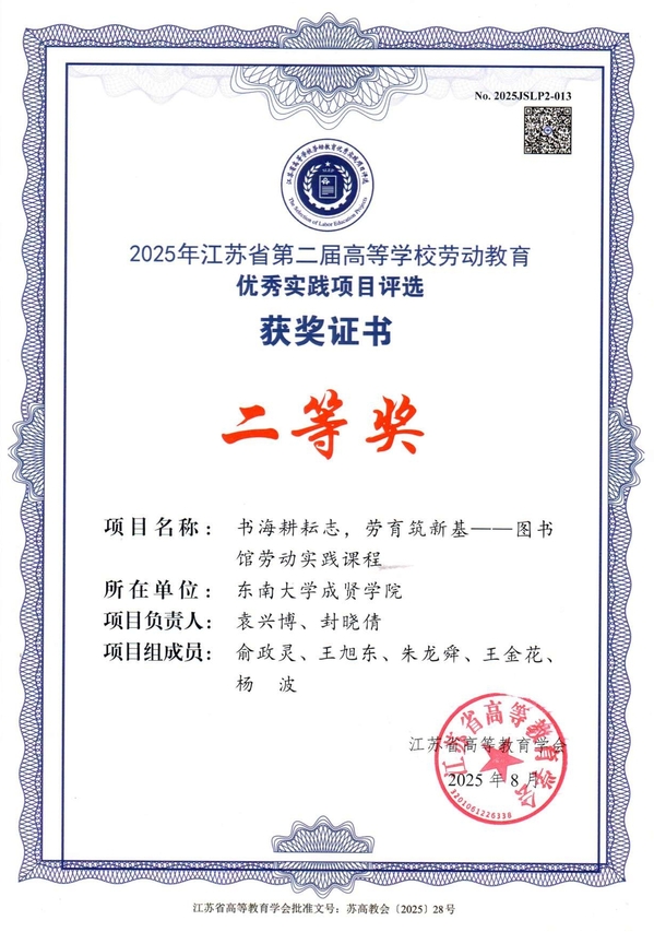 近日,江苏省高等教育学会公布了2025年江苏省第二届高等学校劳动教育优秀实践项目评选结果,我校图书馆报送的案例《书海耕耘志,劳育筑新基——图书馆劳动实践课程》荣获等奖。