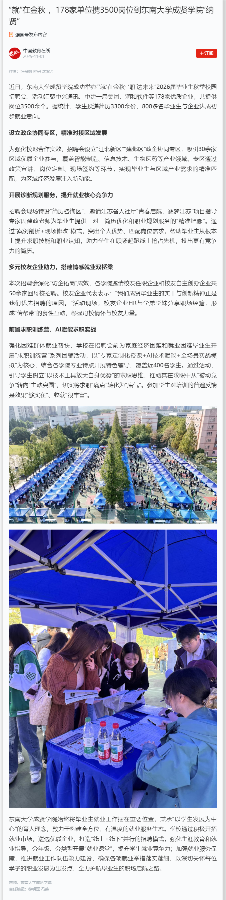 【学习强国】“就”在金秋,178家单位携3500岗位到东南大学成贤学院“纳贤”