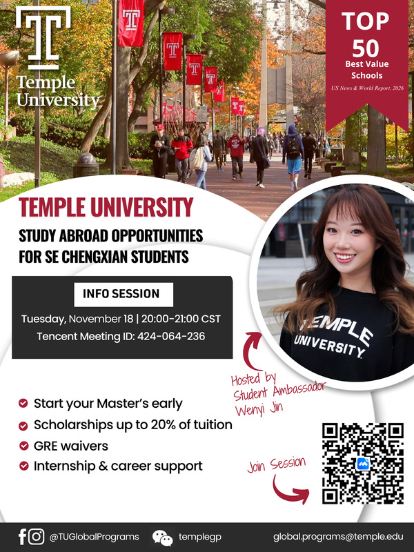美国天普大学是与我校签署合作交流协议的大学之一。为了更全面了解该大学专业设置、项目优势、申请硕士条件及校园生活等内容,美国天普大学拟将为我校学生举办“东南大学成贤学院线上宣讲会”,具体安排如下: