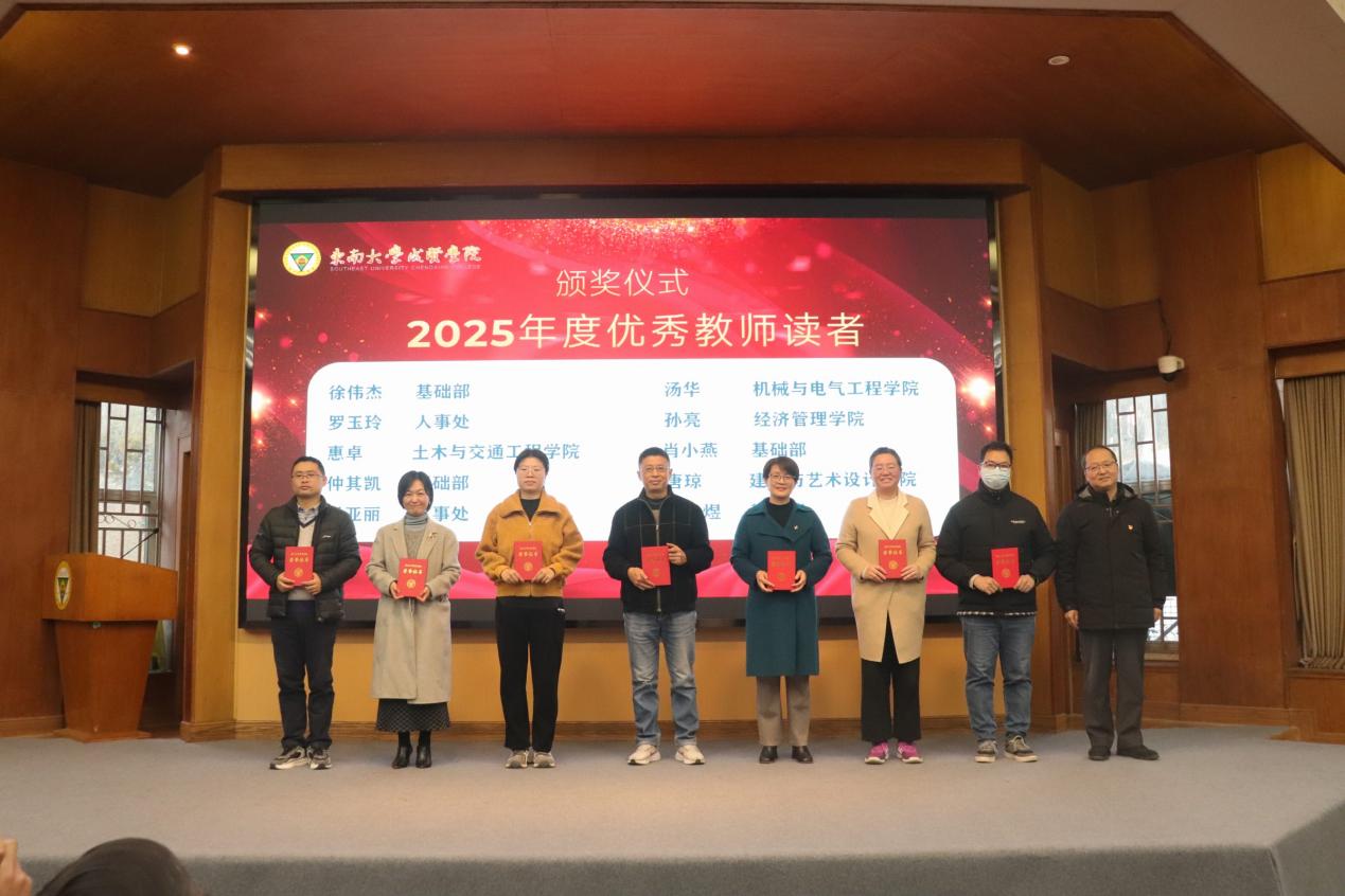 学院党委书记张志胜、学生处处长施杰、图档信息中心主任沈冬生分别为2025年度“优秀教师读者”代表、图书馆阅读马拉松活动一等奖获奖学生代表、2025年度优秀学生读者代表颁奖。