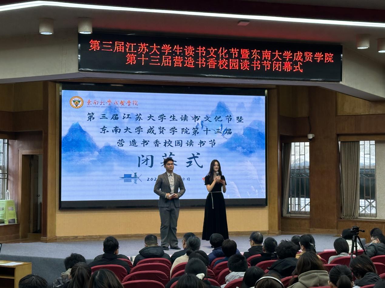 12月9日,第三届江苏大学生读书文化节暨东南大学成贤学院第十三届营造书香校园读书节闭幕式活动在真知馆报告厅圆满结束。东南大学成贤学院党委书记张志胜,校工会主席、图档信息中心主任沈冬生,学生处处长施杰,各二级学院领导及获奖师生代表出席活动,200余名师生参加闭幕式。