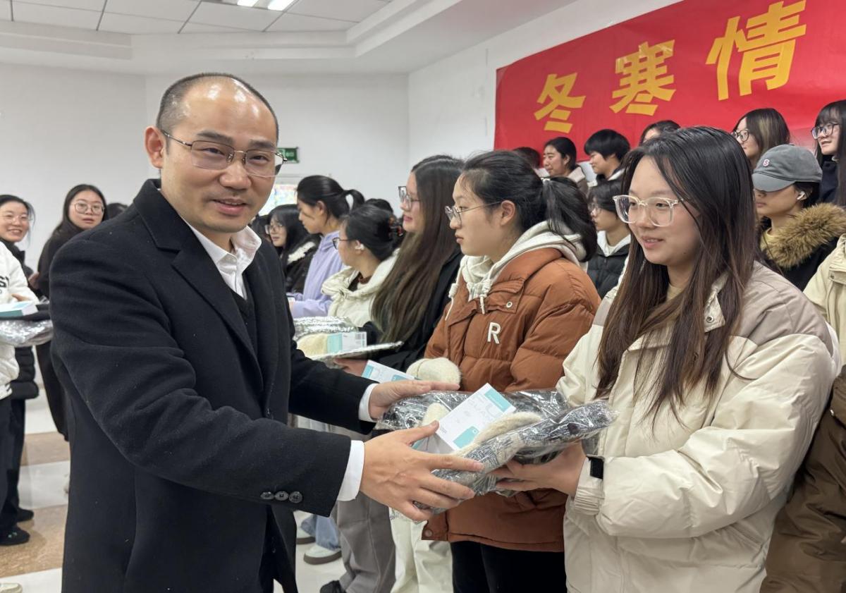 (为学生发放暖冬物资)