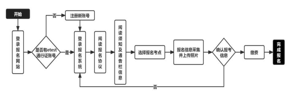 3.网上报名需使用ETEST通行证账号登录,该账号在教育部教育考试院所有使用ETEST通行证的报名系统中通用。若考生已有ETEST通行证,则直接登录报名;若没有该账号,需要先进行账号注册后再进行报名。请使用本人真实有效的邮箱和手机号进行注册,以便必要时重置或找回密码。