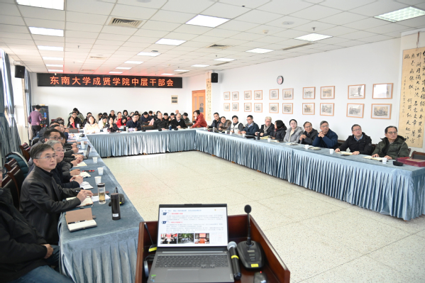 1月7日中午,东南大学成贤学院在图书馆5013会议室召开中层干部会,总结2025年工作成效、研讨重点问题、部署下一阶段任务。学校党委书记张志胜、常务副院长黄学良共同主持会议,党委副书记、副院长、纪委书记尹威,副院长戴玉蓉,副院长魏丽玲,各职能部门副职及以上同志,各二级学院(部)党政副职及以上同志共同参会。