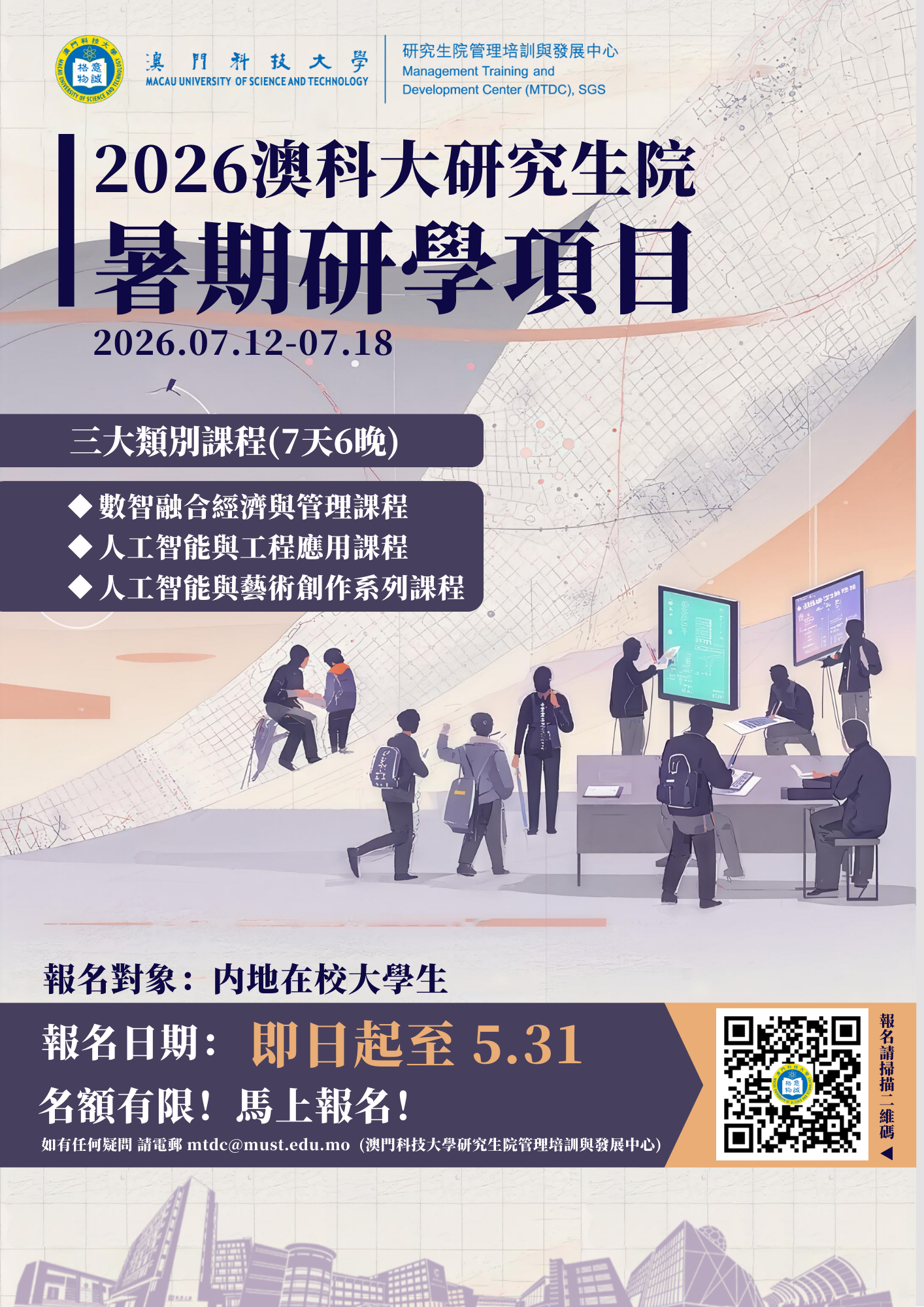 开班时间:2026年7月12日-7月18日(共 7 天 6 晚); 课程地点:澳门科技大学; 参加人员:我校在读学生