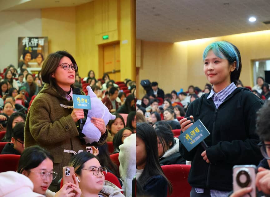 观影结束后,主创团队尹露、杨荔钠和文淇依次登台,从创作初心、角色塑造到拍摄幕后的暖心故事,与同学们畅聊影视创作的坚守与热爱,深度解读影片对代际沟通、女性成长的思考。在观众感悟分享与提问环节,同学们踊跃发言,有的结合自身经历讲述影片带来的亲情触动,反思与父母的相处模式;有的围绕影片叙事、演员表演向主创提问,主创团队耐心答疑解惑,现场互动真挚走心,思想碰撞的火花不断迸发。