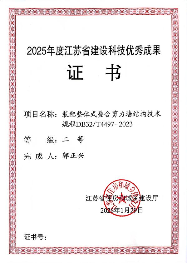近日,由东南大学成贤学院土木与交通工程学院院长郭正兴教授参与主编的《装配整体式叠合剪力墙结构技术规程DB32/T4497-2023》地方标准,荣获2025年度江苏省建设科技优秀成果二等奖。该奖项由江苏省住房和城乡建设厅评定,是全省建设科技领域的重要荣誉,彰显了我校土木与交通工程学院在建筑工业化领域的科研实力与行业影响力。