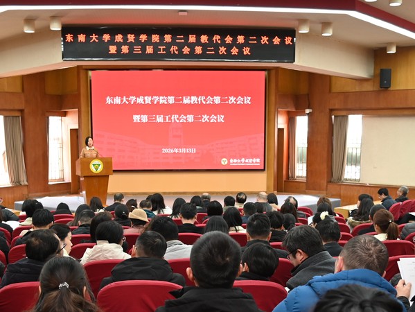 3月13日,东南大学成贤学院第二届教职工代表大会第二次会议暨第三届工会会员代表大会第二次会议在真知馆报告厅举行。学校全体院领导,教代会正式代表、列席代表、特邀代表以及工代会正式代表参加会议。大会由副院长戴玉蓉主持。
