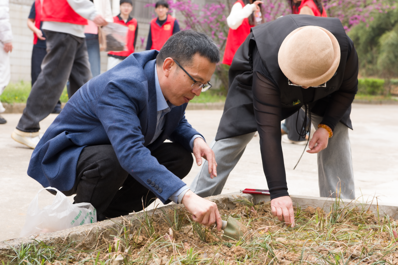 致辞结束后,春种环节正式拉开帷幕。黄学良常务副院长率先拿起工具,带领全体师生来到工培中心广场的绿地,亲身参与花卉种植与播种。学校绿化队的工作人员提前做好场地整理,现场细致讲解百合种球的栽种技巧、种植深度以及二月兰种子的播撒方法,耐心解答师生们提出的疑问,确保每一株幼苗、每一粒种子都能顺利扎根生长。师生们热情高涨、分工协作,有的弯腰松土、有的扶正种球、有的挥锹培土,还有的手持种子,小心翼翼地沿着绿地边缘均匀播撒,动作认真而专注。指尖拂过湿润的泥土,种子承载着希望落入沟壑,大家一边劳作一边交流种植心得,欢声笑语间,原本平整的绿地被点缀上了点点生机,每一株栽种好的百合、每一粒播下的二月兰种子,都寄托着师生们对春天的期盼、对劳动的敬畏和对成长的向往。整个种植现场暖意融融,一派生机勃勃的春耕景象,充分展现了师生们积极向上、乐于实践的良好风貌。