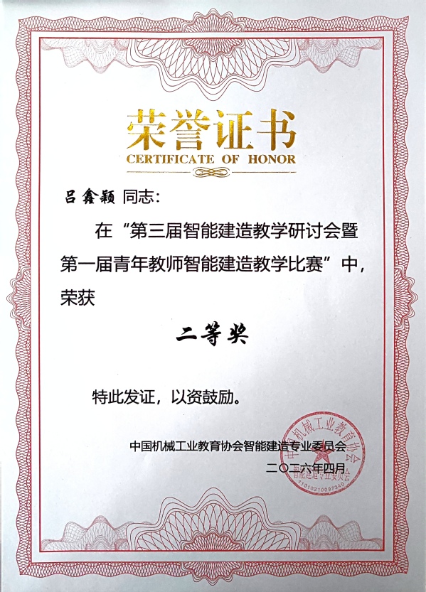 近日,由教育部高等学校土木类专业教学指导委员会指导、中国机械工业教育协会智能建造专业委员会等单位主办的第三届智能建造教学研讨会暨全国第一届青年教师智能建造教学比赛在苏州圆满落幕。我校土木与交通工程学院吕鑫颖老师凭借扎实的专业功底、创新的教学设计与出色的课堂表现,在全国众多参赛选手中脱颖而出,荣获二等奖,充分展现了我校青年教师过硬的教学能力与良好的专业素养。