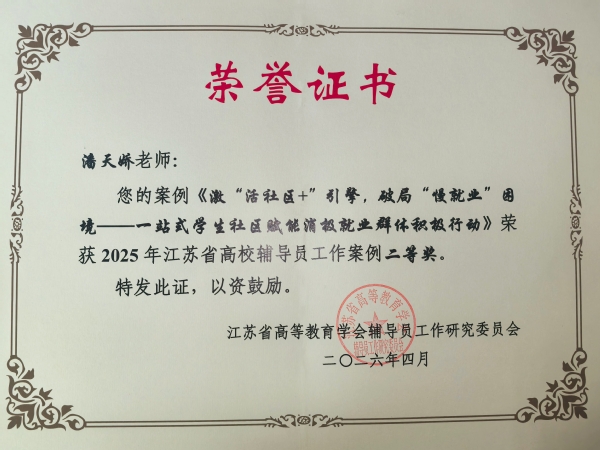 近日,2025年江苏省高等教育学会辅导员工作研究委员会辅导员工作案例遴选结果正式公布。经学校推荐、形式审查与专家评审等多轮遴选,我校经济管理学院辅导员潘天娇撰写的辅导员工作案例《激活“社区+”引擎,破局“慢就业”困境——“一站式”学生社区赋能消极就业群体积极行动》从全省参评作品中脱颖而出,荣获二等奖。据悉,本次案例评选从全省各高校征集推荐作品,经严格评审,最终遴选出一等奖23篇、二等奖46篇、三等奖61篇。