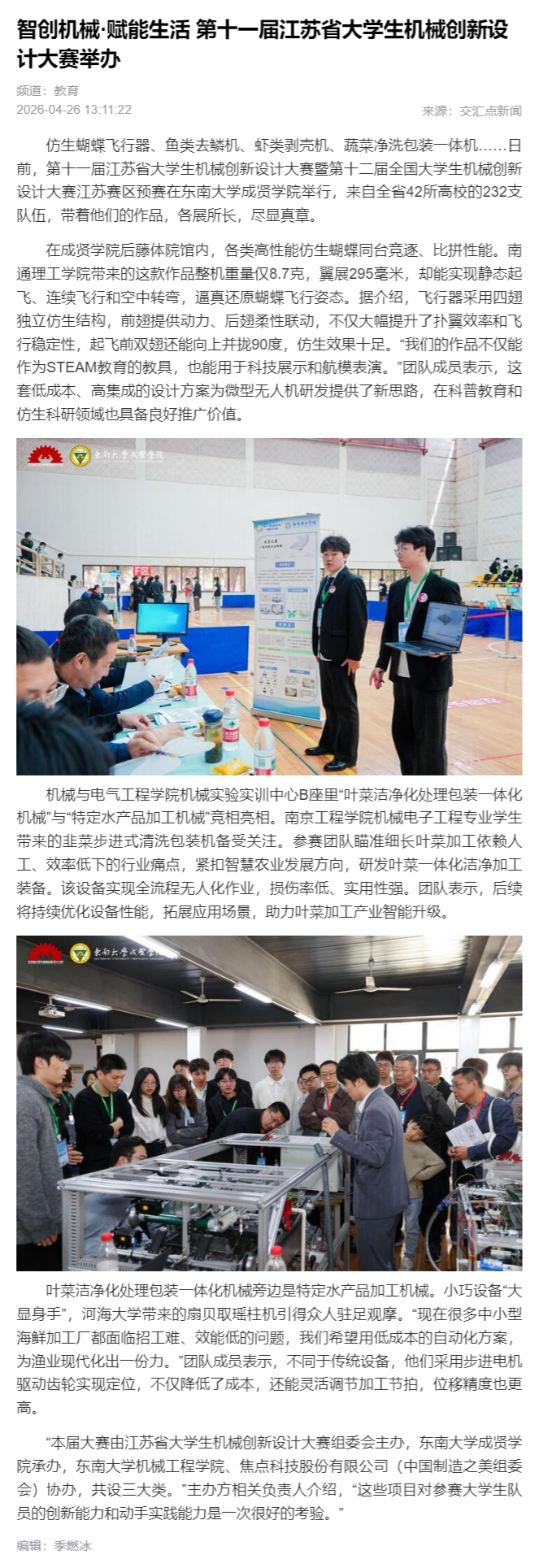 【交汇点新闻】智创机械·赋能生活 第十一届江苏省大学生机械创新设计大赛举办